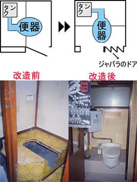 トイレが低く立ち上がりに不自由していたため、便器下に木製の置台を作製し、高さを上げました。タンク位置や排水ホースの延長等の工事も含みます。